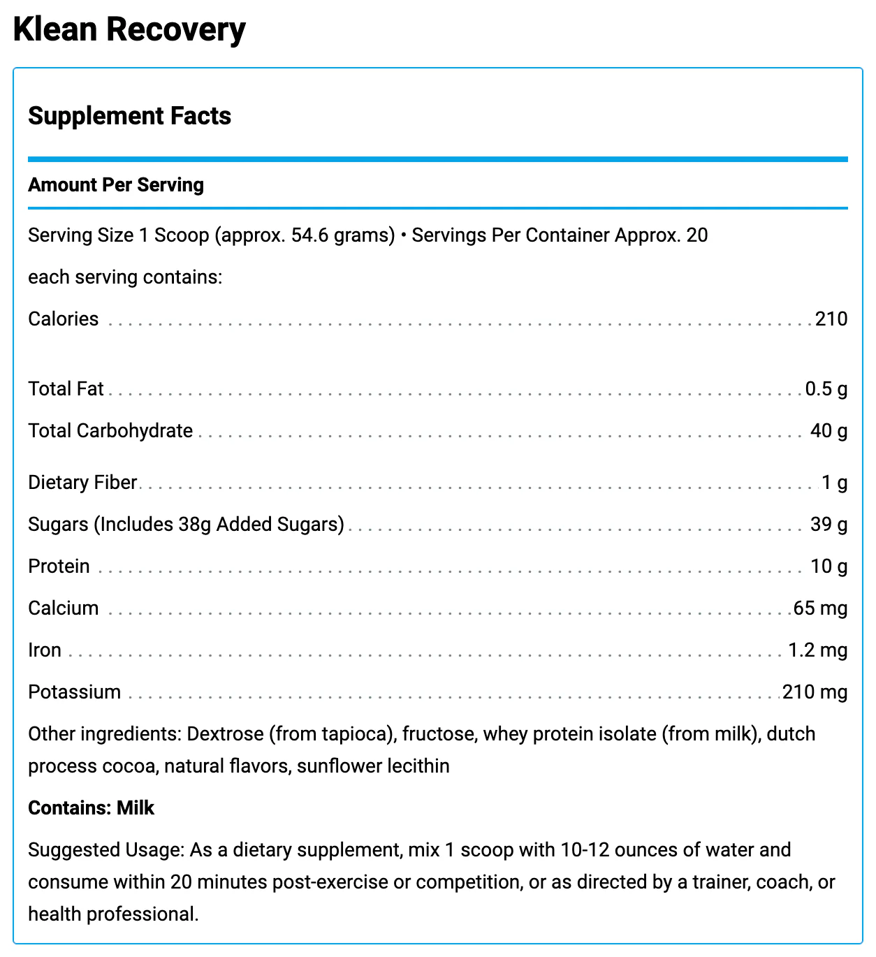 Athletes regularly train before sunrise, putting in the early-morning work necessary to succeed. To perform at peak levels, they require not only optimal training, but optimal recovery. Klean Recovery is a delicious milk chocolate-flavored powder formulated with the athlete’s recovery in mind. Its 4:1 ratio of carbohydrates to protein helps support glycogen re-synthesis and muscle protein synthesis immediately after a workout. Klean Recovery sources all protein as whey isolate, that is quickly and efficiently absorbed. It is rich in amino acids such as methionine, histidine and arginine that are crucial to muscle building and nitrogen balance.